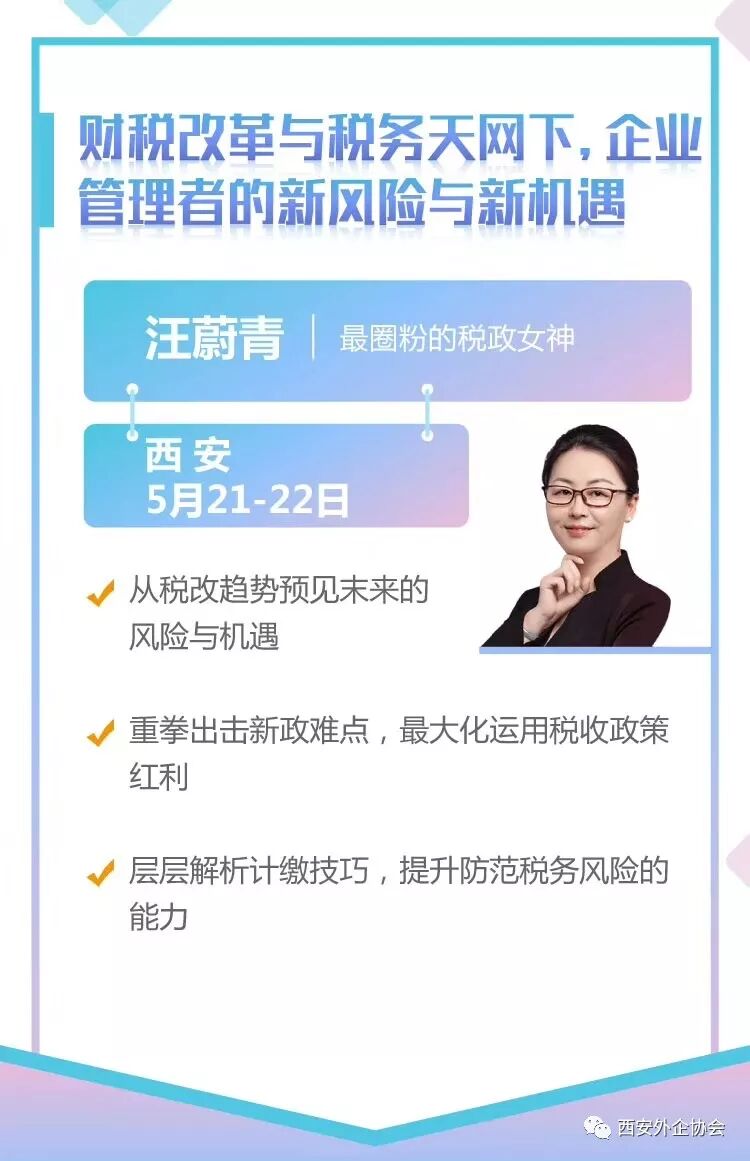面对这种“强减税、严征管”的新形势,企业内部实务操作和内部管理将何去何从?企业该如何应对?为此西安外商投资企业协会特邀请知名税务专家汪蔚青老师,为会员《税务改革与数据天网下,企业管理者的新风险与新机遇》。通过大量来自实务的案例,进行详细讲解,请各单位积极组织相关人员参加学习。